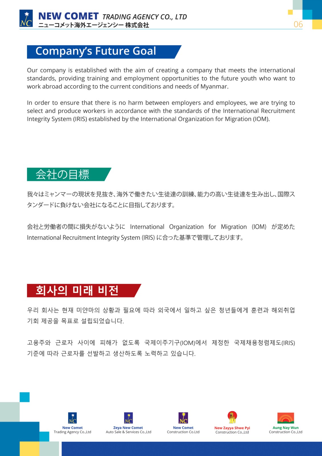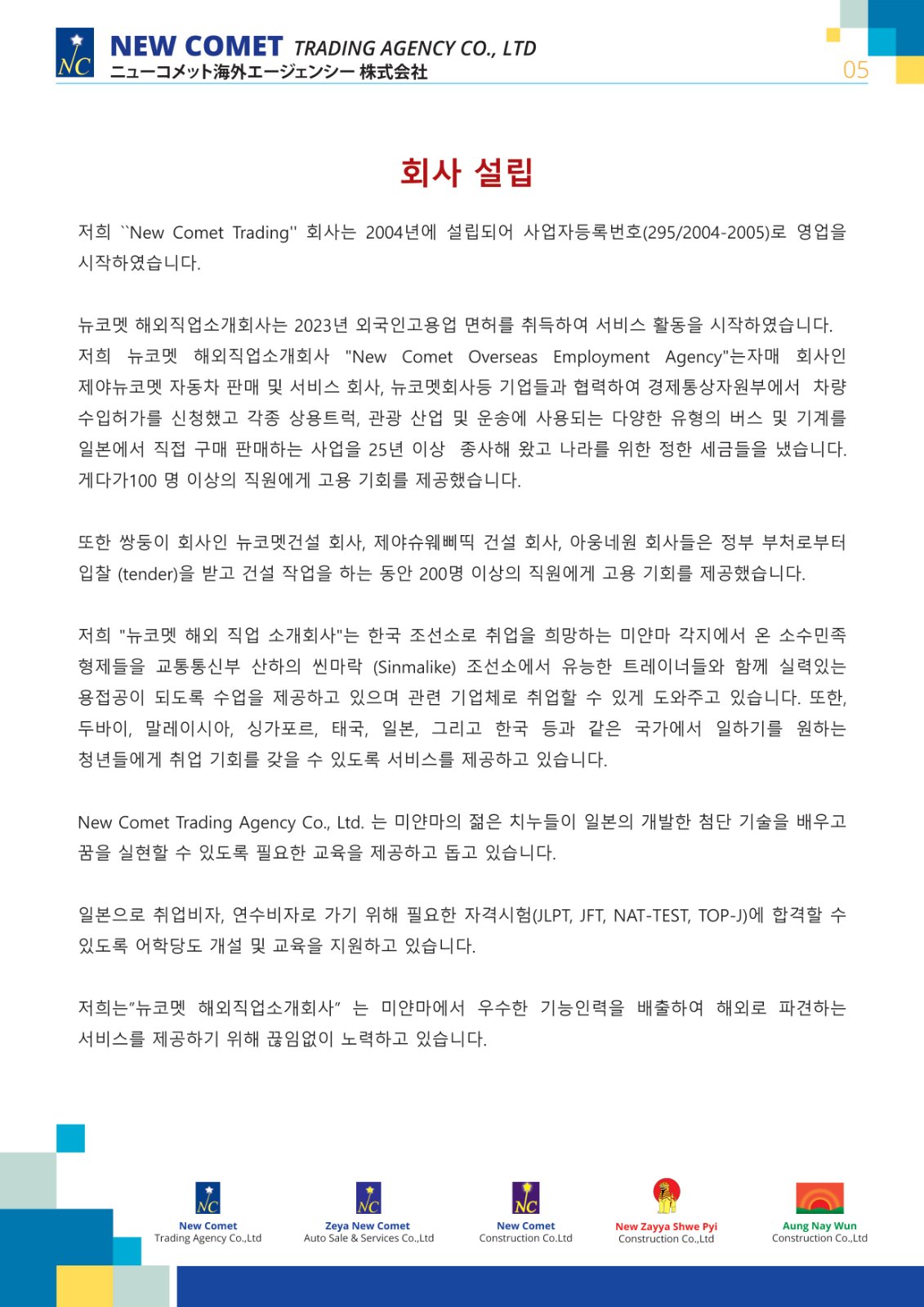 NEW COMET TRADING AGENCY Co.,Ltd (New Comet Overseas Employment Agency) license was obtained in 2023 and since then, the company has started to carry out service activities.